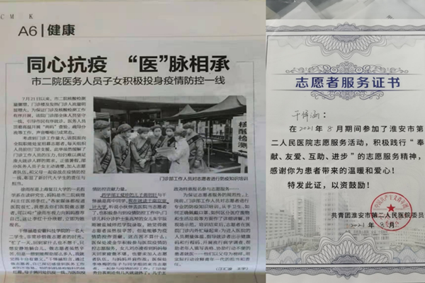 因在抗疫一线志愿服务期间的优异表现,淮安电视台和淮海晚报对干怿涵等志愿者进行了采访。干怿涵说道:“每天回家后动也不想动,只想安静地躺会儿,但是想到能为社会做点事情,能够帮助到那么多人,我感觉很有意义”。在他看来,作为开云网页版的一名入党积极分子,在国家和社会需要的时候,应该不畏困难,毅然决然的挺身而出。