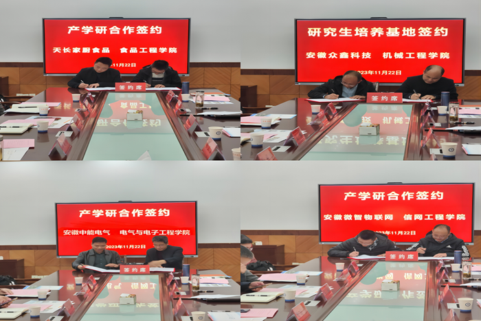 会上,食品工程学院、电气与电子工程学院、信息与网络工程学院分别与天长家厨食品有限公司、安徽中能电气股份有限公司、安徽微智物联网科技有限公司进行了产学研合作签约;机械工程学院与安徽众鑫科技股份有限公司签署了共建研究生联合培养基地协议。