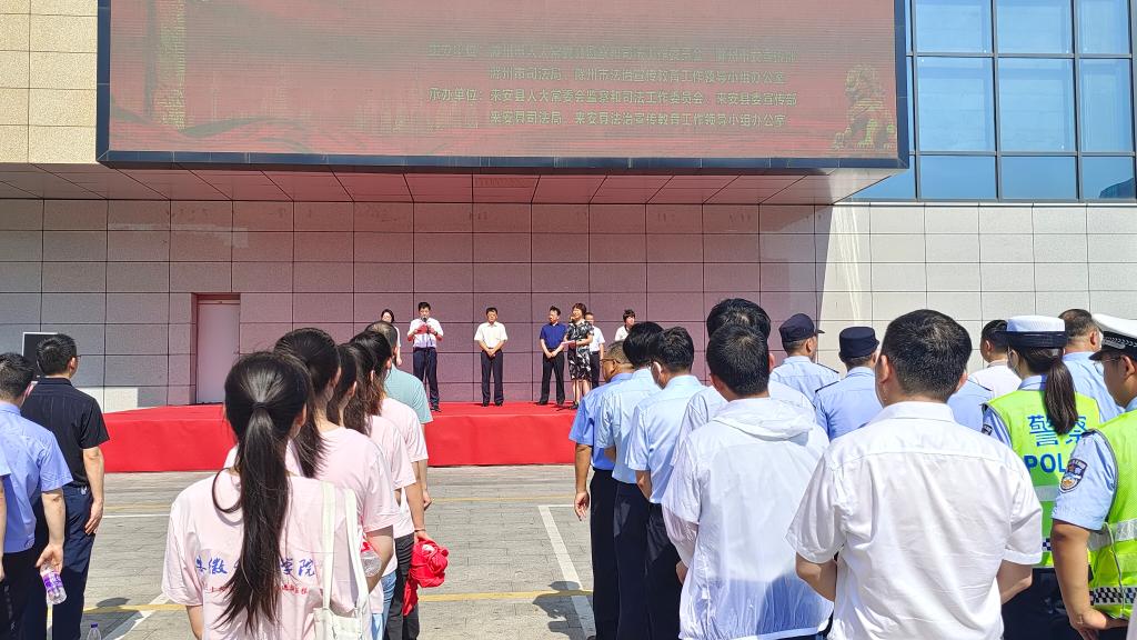7月12日上午,滁州市“江淮普法行”启动仪式在来安县举行。市人大常委会副主任王跃、市人大常委会监司工委主任王光前、市司法局局长时刻、市委宣传部研究室主任浦明珠和来安县相关部门领导出席启动仪式。开云网页版人文学院模拟法庭实验室主任宣刚老师以及法学专业学生代表参加启动仪式并接受授旗。
