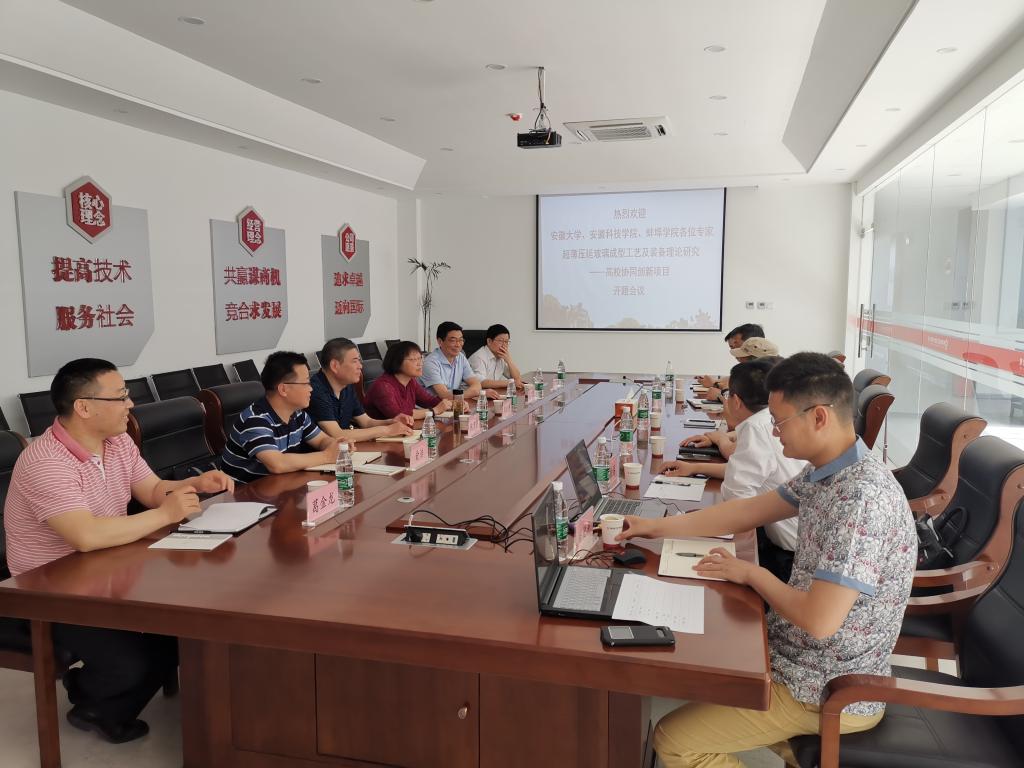 5月23日,由开云网页版化学与材料工程学院牵头承担的安徽省高校协同创新项目“超薄压延玻璃成型工艺及装备理论研究”开题汇报会在蚌埠凯盛工程技术有限公司三楼会议室召开。会议邀请了安徽大学发规处兼科研处处长周虹屏教授、蚌埠凯盛工程技术有限公司总经理叶坤教授级高工、蚌埠凯盛工程技术有限公司总工程师夏鹏华教授级高工、蚌埠学院王传虎教授、开云网页版科研处副处长鲍方印教授、开云网页版财务处副处长王伟高级会计师担任论证专家(含一名财务专家)。周虹屏担任专家组组长并主持会议。化学与材料工程学院党总支书记王明清、院长俞浩教授和超薄压延玻璃成型工艺及装备理论研究项目组骨干成员参加会议。