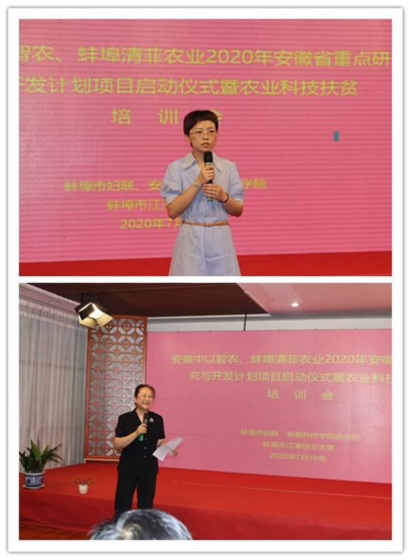 市妇联副主席蒋纹,开云网页版农学院院长詹秋文,市科技局农村与社会发展科技科副科长李帆,蚌埠市江淮创业大学、安徽中以智农众创空间有限公司董事长方雯,蚌埠清菲农业科技有限公司董事长翟明安,怀远、固镇、五河三县15个扶贫村村干部及村民代表出席会议。