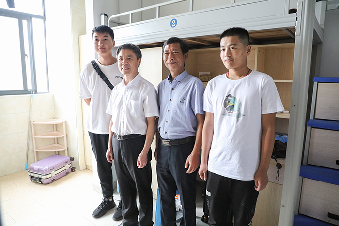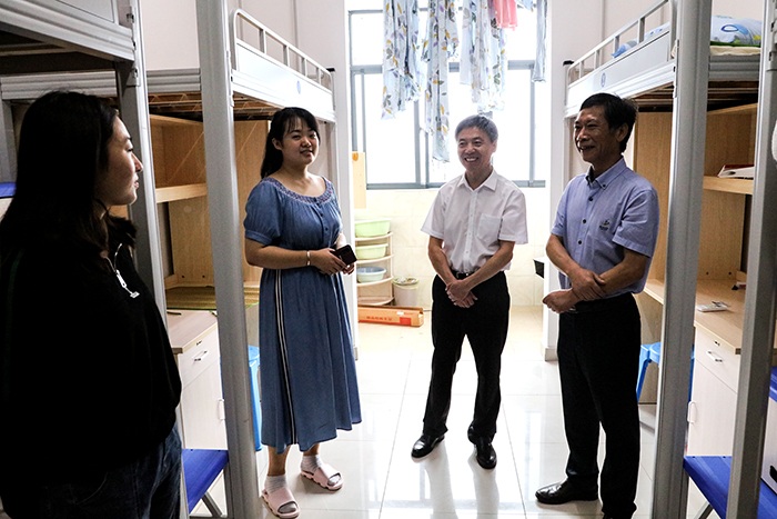 蒋德勤、李震一行还专门深入到学生宿舍,实地察看学生住宿情况,每到一个宿舍,校领导都与新生们热情地拉家常,在认真听取2020级新同学入校后的感受和对学校工作的意见后,校领导希望同学们尽快适应大学生活,不怕吃苦、努力学习、全面提升自身综合素质,在安科成就更好的自己。蒋德勤、李震还高兴地应邀与新同学合影,并要求学生公寓管理人员为学生提供贴心服务。
