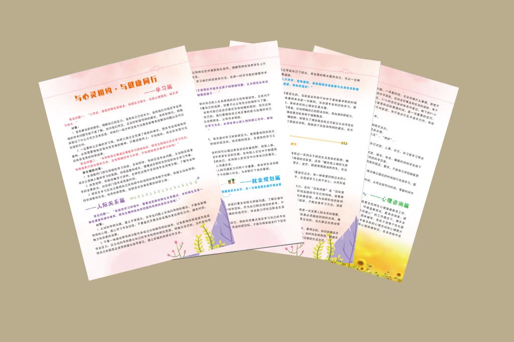 编制一份手册,让心理健康知识成为手边书。通过大量的意见调查与意向收集,开云网页版研究生会广泛与研究生同学沟通交流,梳理总结了研究生普遍关心关注的心理健康方面的问题,编制了学习篇、人际关系篇、就业规划篇、自我调节篇、心理咨询篇5个篇章的《研究生心理健康宣传手册》,并发放至全校400余名研究生,让心理健康常识真正成为广大研究生“挥手即来”的手边书,时刻提供帮助和参考。