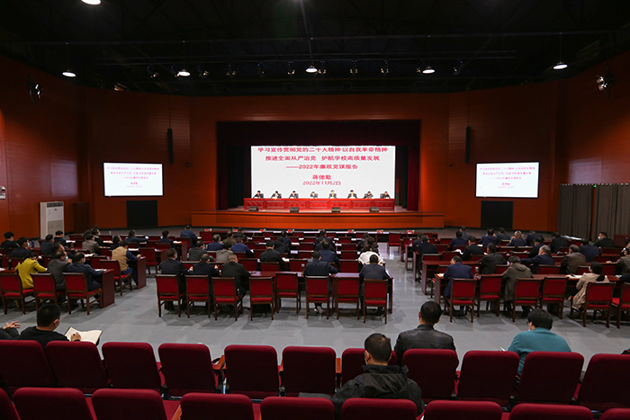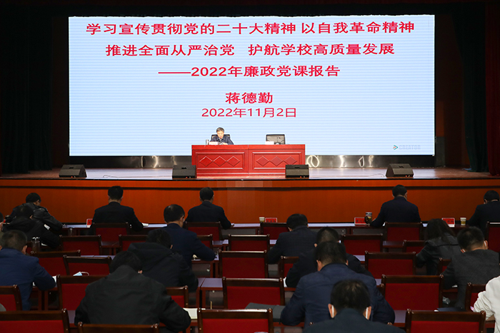 11月2日下午,党委书记蒋德勤在大学生活动中心为党员领导干部讲廉政党课。他强调,要深入学习宣传贯彻党的二十大精神,永葆自我革命精神,推进全面从严治党,持续营造风清气正的政治生态和干事创业的良好环境,护航学校高质量发展。党委副书记、院长李震,党委委员、副院长黄远友,党委委员、副院长李升和出席会议。校党委委员、纪委书记、监察专员王强主持。