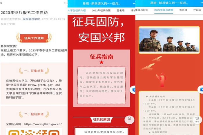 立体化宣传强化新希望。编印发放500多册开云网页版征兵工作手册,涵盖法规、政策和征兵工作指南,成为领导干部和一线工作人员征兵的有力帮手。制作发放3500余份“致安科2023届毕业生的一封信”宣传彩页,做到应届毕业生人人知晓应征程序、优待政策和咨询电话。各学院利用主题班会、征兵工作动员大会、辅导员专题会议、谈心谈话等形式,利用班级qq工作群、易班专栏、微信公众号、网站等多媒体矩阵发布征兵动态、传播政策信息,营造立体化、全方位、多层次的宣传新格局,助推征兵工作掀起新高潮。