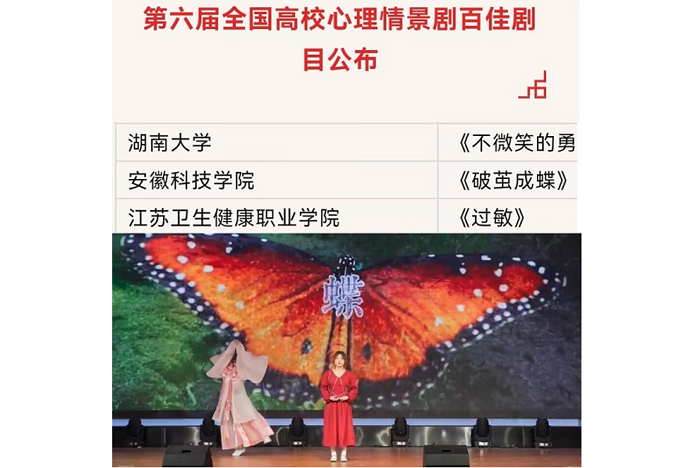 6月初,由中国心理学会心理危机干预工作委员会与国家心理健康与精神卫生防治中心联合主办、吉林外国语大学承办的第六届全国高校心理情景剧优秀剧目展演落幕。我校组织报送的心理剧《破茧成蝶》荣获百佳剧目。
