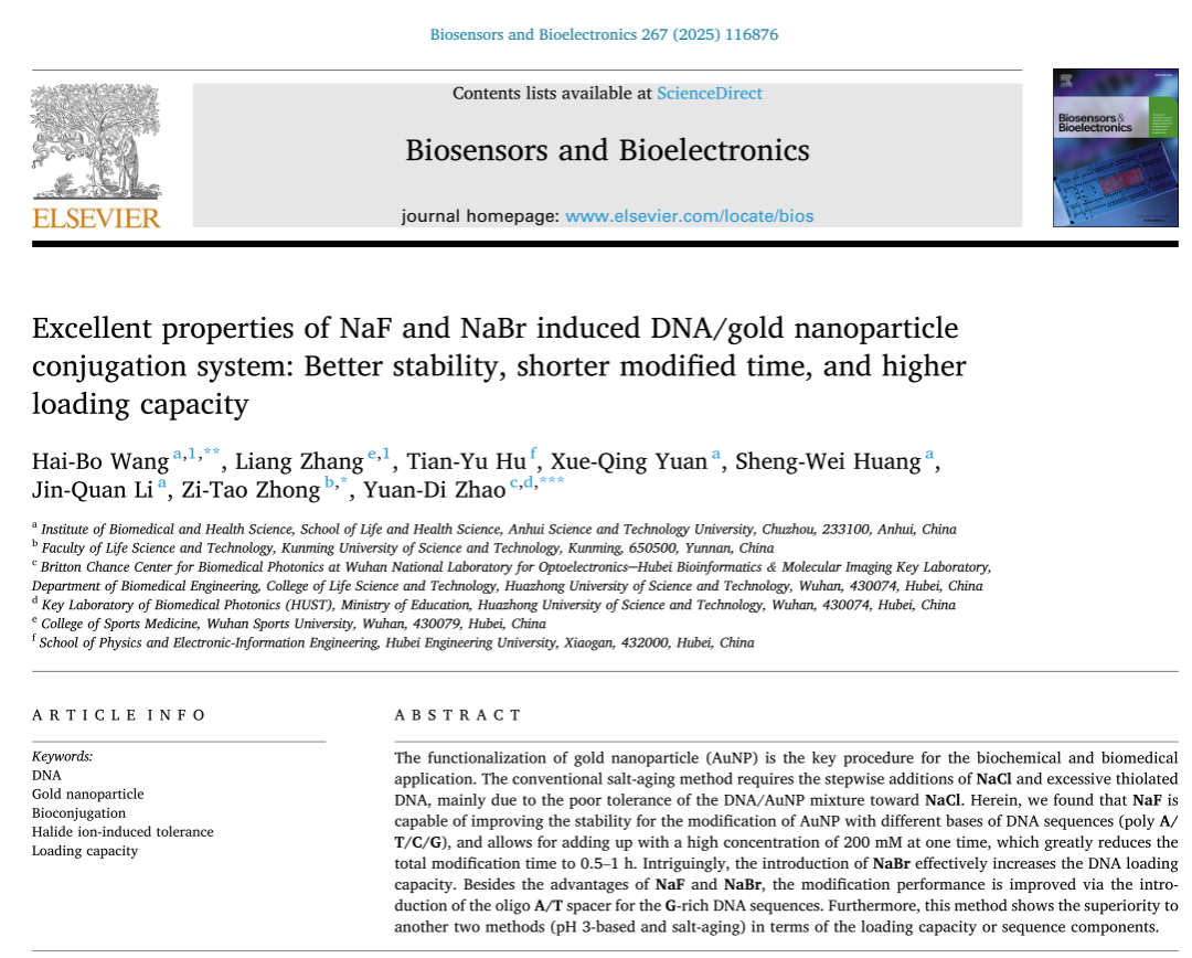 近日,我校生命与健康科学学院王海波博士(第一/通讯作者)在生物传感领域国际顶级期刊《Biosensors & Bioelectronics》(中国科学院一区Top期刊,影响因子:10.7,CiteScore:20.80)在线发表了题为“Excellent properties of NaF and NaBr induced DNA/gold nanoparticle conjugation system: Better stability, shorter modified time, and higher loading capacity”的研究成果,DOI: 10.1016/j.bios.2024.116876。该论文第一单位为开云网页版,昆明理工大学钟子涛博士和华中科技大学赵元弟教授为共同通讯作者。本研究在安徽省教育厅重点项目(2023AH051869)、开云网页版引进人才项目(200181)以及安徽雪郎生物科技股份有限公司的经费资助下完成。