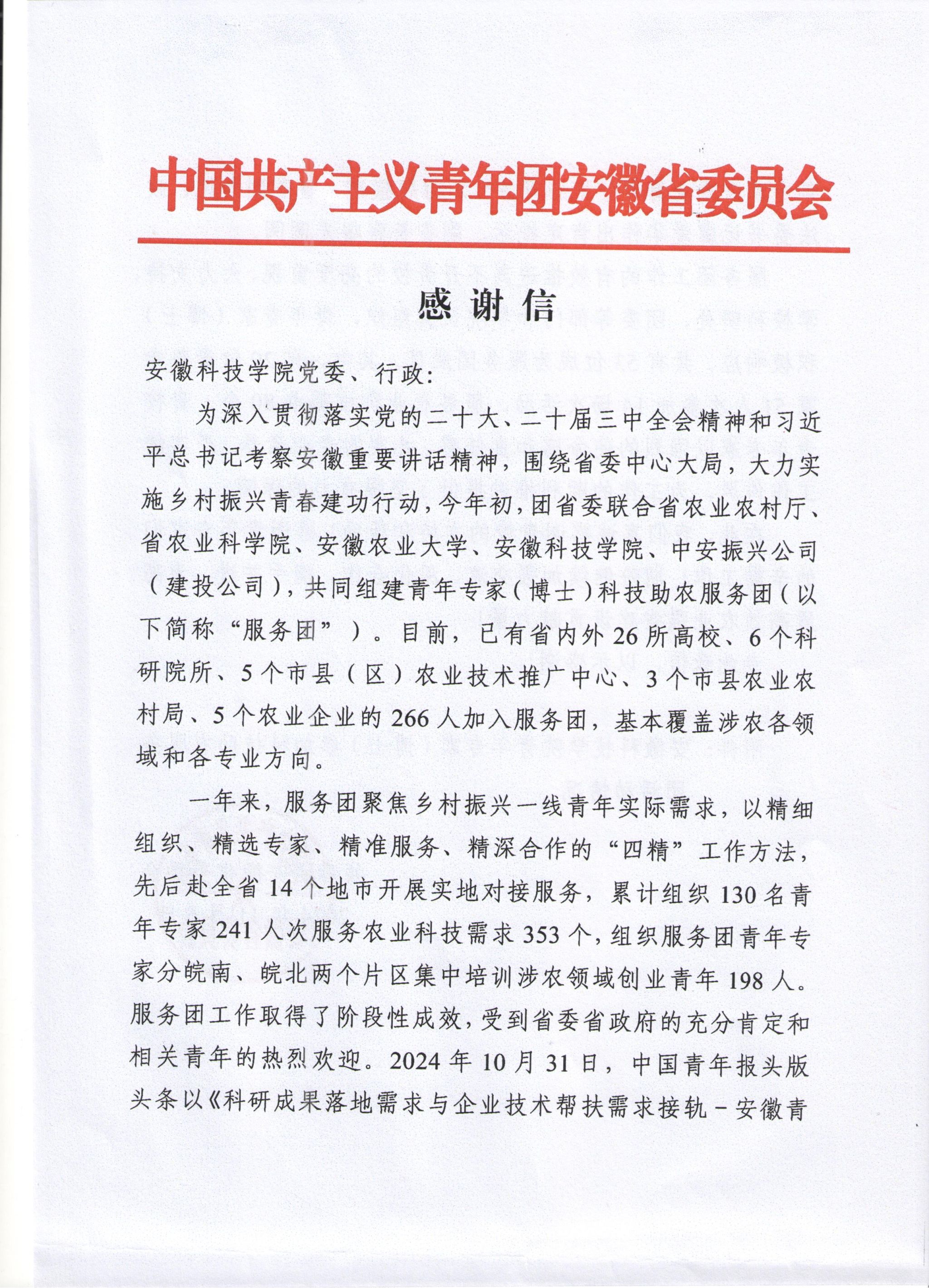 近日,共青团安徽省委员会向我校发来感谢信,感谢我校青年专家(博士)在科技助农服务团中付出的辛勤工作,并表述期盼继续加强交流、深化合作、携手并进,为高质高效农业强省建设贡献力量。