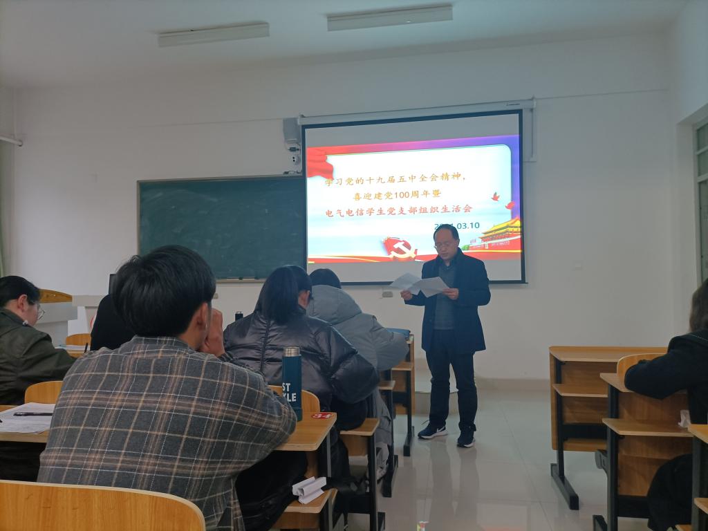 3月10日下午,电气与电子工程学院电气电信学生党支部在致知楼B206召开了“学习党的十九届五中全会精神,喜迎建党100周年”为主题的组织生活会与民主评议党员大会。会议由支部书记宋志华主持,支部全体党员参加,学院党委委员尚磊应邀到场点评。