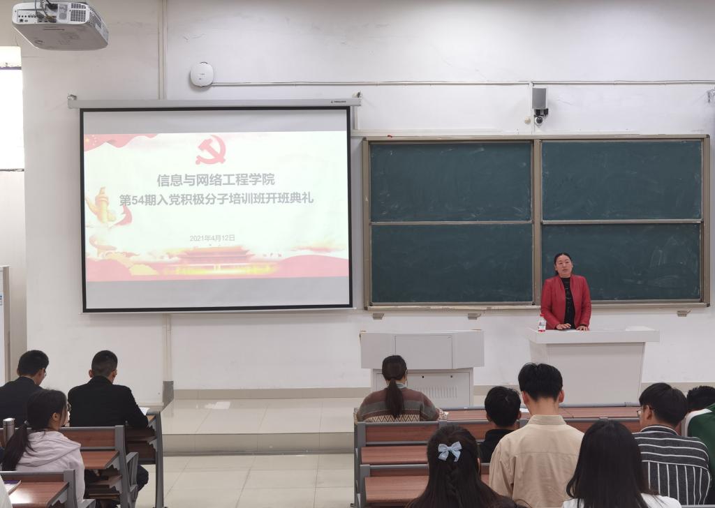 为加强对入党积极分子进行党史党性教育,落实党员发展工作的相关要求,4月12日中午,信息与网络工程学院在致知楼A111举办第54期入党积极分子培训班开班典礼。学院党委副书记韦乃学,党政办公室副主任王培培,专职辅导员陈凯、李军成出席会议。培训班152名学员参加会议,会议由王培培主持。