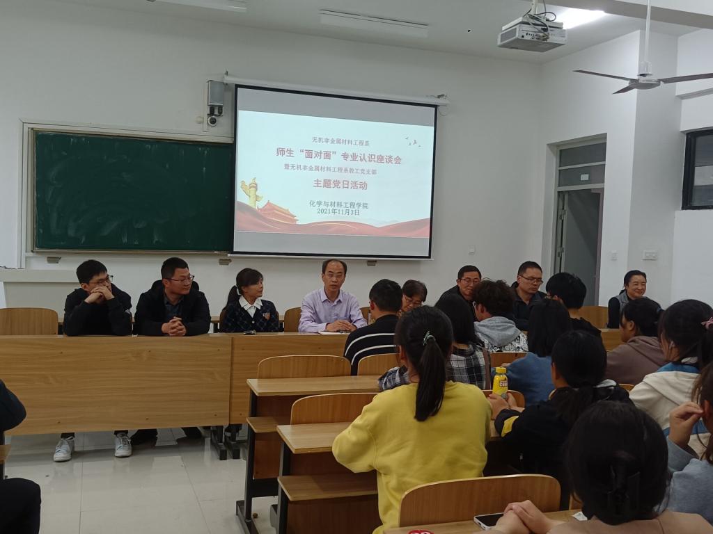 伴随着秋天的脚步,迎着同学们真挚的笑脸,为了帮助2021级新生了解专业方向,稳固专业思想,更好的融入大学生活,11月3日下午,化学与材料工程学院应用化学系教工党支部、无机非金属材料系教工党支部、材料科学与工程系教工党支部、新能源材料与器件系教工党支部在各党支部书记的组织下结对相关专业召开了“师生面对面专业认知座谈会”暨教工支部主题党日活动,4个专业2021级新生分专业参加座谈会。