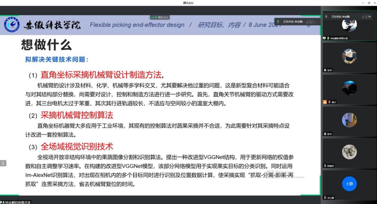 此次答辩会主要以PPT汇报方式进行,6名2021级研究生依次向导师组汇报了开题报告,他们从研究背景、研究目的和意义、研究目标及内容、研究方案及可行性分析、创新点与预期成果等方面进行了详细阐述。导师组老师本着高要求、严把控的学术精神,对同学们的开题报告进行了认真评审,逐一点评,重点对不足之处及改进方向提出了具体意见和建议。