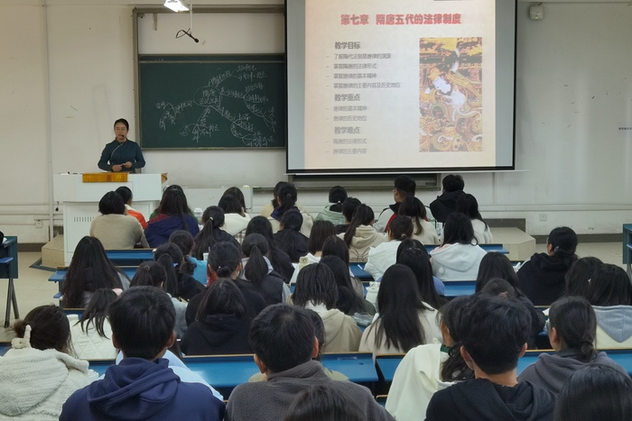 田野老师讲授的是《中国法制史》的“隋唐五代的法律制度”。田野老师仪表庄重,举止大方,语言流畅,条理清晰,讲课内容精炼充实,重点难点突出,师生互动充分,教学课件制作精美,爱国主义思政元素巧妙贯穿其中,体现了文化自信。