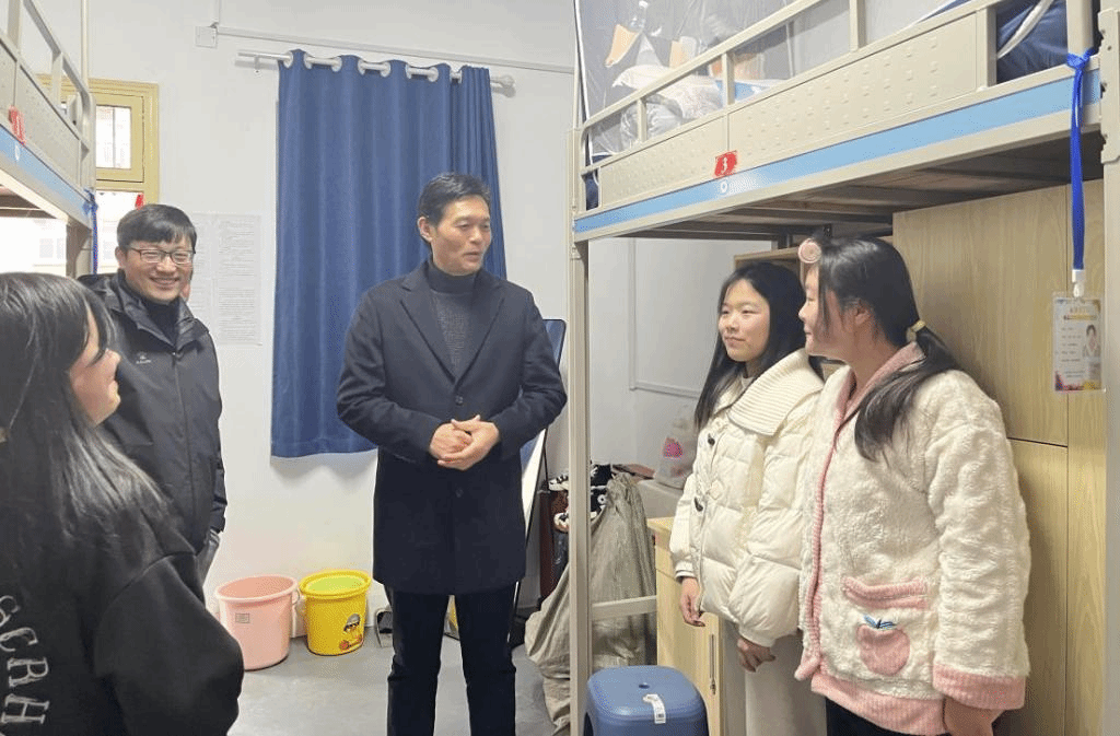 “寒假期间过的怎么样?”“父母身体可都好?”“课程复习的怎么样?”每到一间宿舍,付光玺都与返校同学们亲切交流,仔细询问同学们寒假在家的情况,欢迎同学们愉快返校。他指出,本学期是实行新冠病毒传染病乙类乙管后的第一个学期,同学们要信心满怀,精神振奋,做好宿舍卫生和安全工作,以崭新的姿态迎接新学期。学院领导一行重点走访了东五女生宿舍楼,认真了解同学们入住改造更新后宿舍的感受和建议,进一步改善宿舍生活环境。付光玺强调,在学校党委的关心下,学校后勤部门寒假期间加班加点,在艰难的条件下高质量完成了宿舍改造工作,积极为同学们创造良好的学习生活环境,大家要更加努力学习,不辜负学校和家庭的期望。同学们脸上都洋溢着欢快的笑容,对改造一新的宿舍环境赞叹不已,向老师们介绍在学院赠送的相框里张贴宿舍文明公约等特色做法,纷纷表示非常感谢学校和学院的关心,自己一定会调整好状态,珍惜宝贵年华,认真复习,做好规划,以热情饱满的姿态迎接新学期的生活。