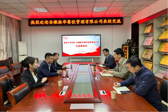 4月10日上午,安徽振华餐饮管理有限公司代表韩彭垒一行到访食品工程学院洽谈合作,学院党委书记付光玺出席并主持座谈会。