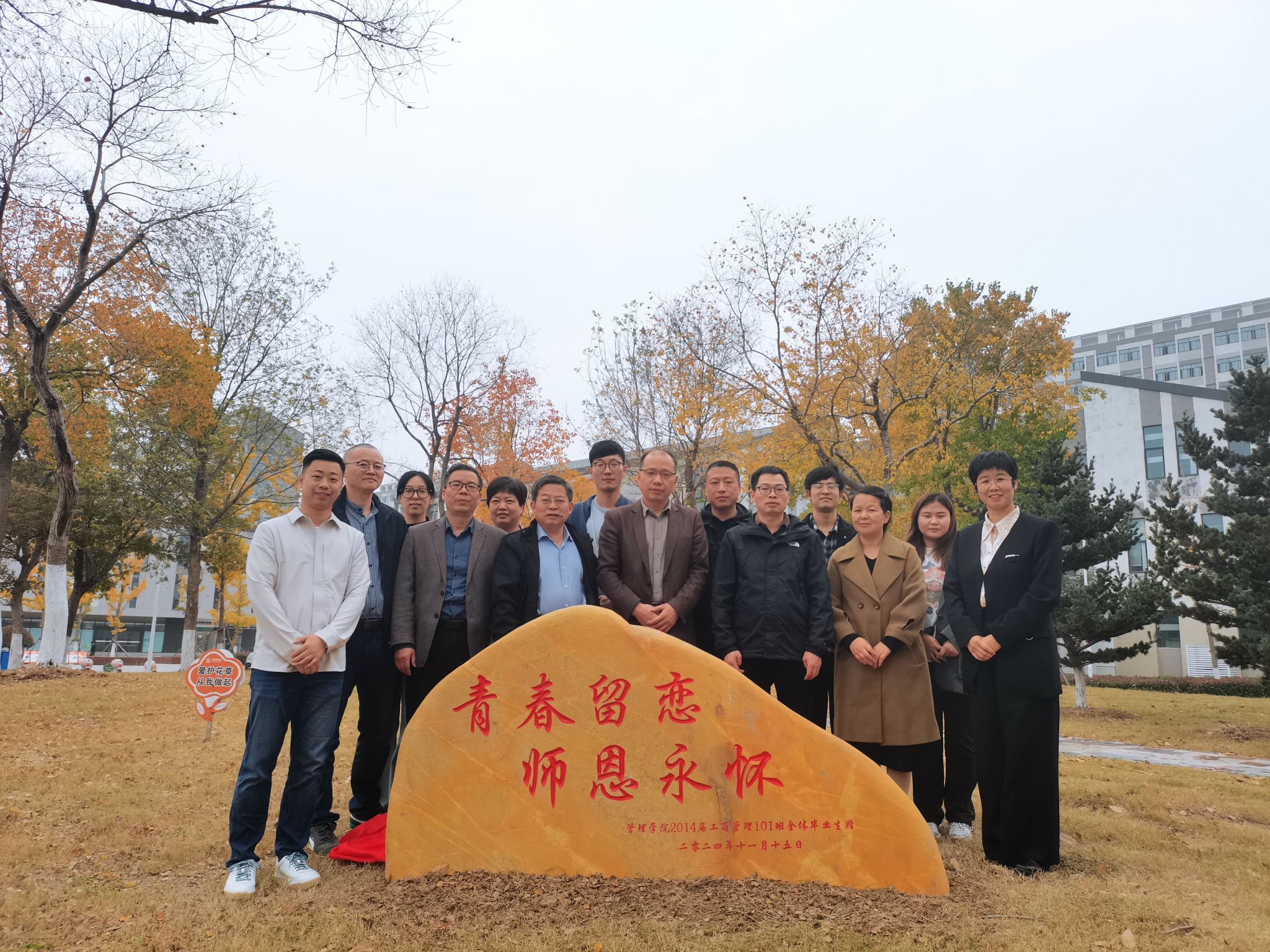 报告会后,王俊超代表班级全体毕业生向母校捐赠文化石。学院党政领导和老师们出席捐赠仪式并与王俊超在文化石前合影留念。