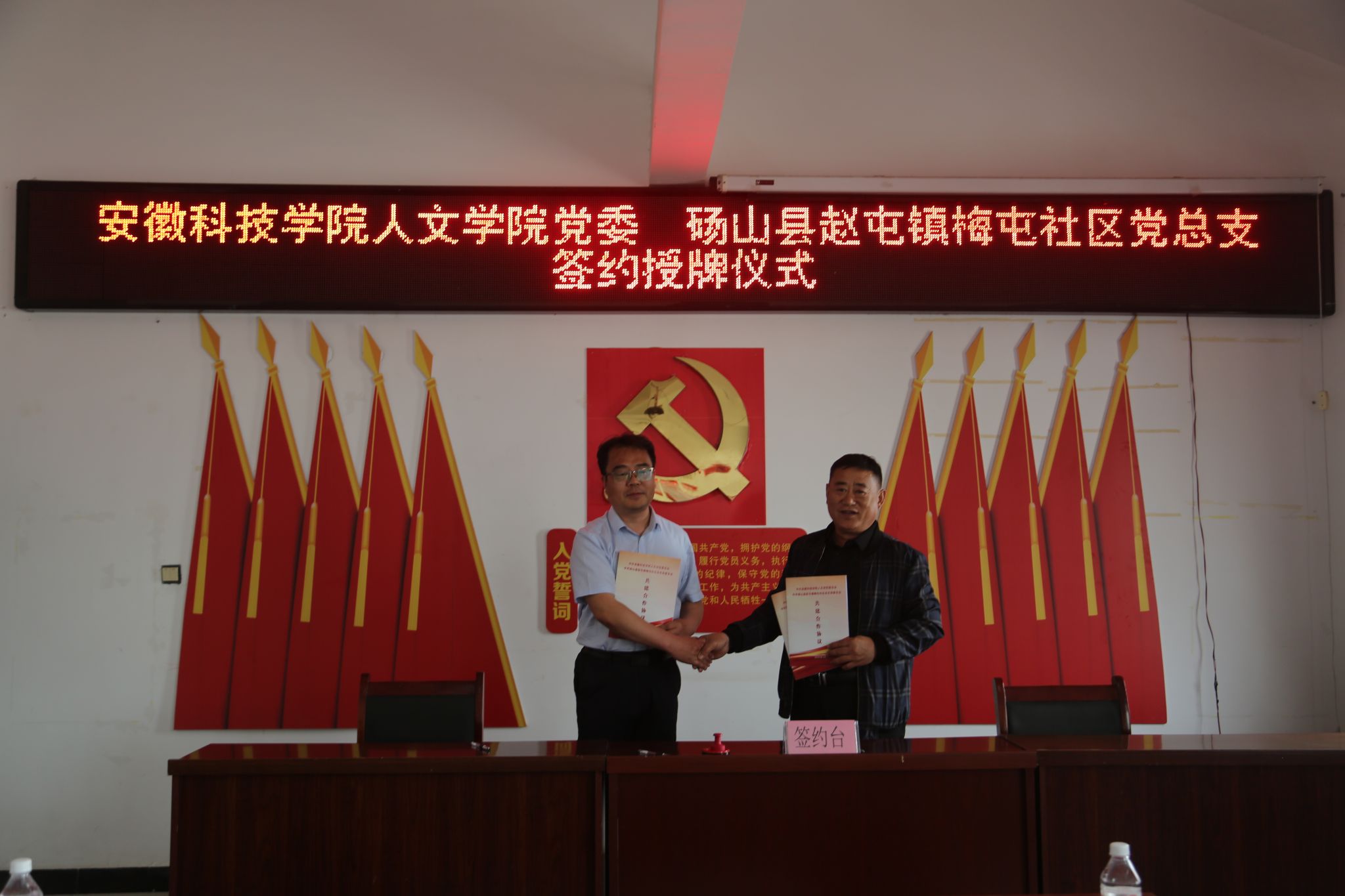 4月11日,人文学院党委与砀山县赵屯镇梅屯社区党总支举行共建合作签约授牌仪式。人文学院党委副书记、院长李晓东,正处级组织员张严政,中文系主任苏兆龙,团委副书记焦雪松,法学系教师范一博,宿州市委网信办主任、市委宣传部副部长梁静,国家税务总局宿州市和砀山县税务局、砀山县委宣传部相关领导,赵屯镇和梅屯社区党政主要负责同志,以及梅屯社区驻村工作队负责同志出席活动。签约授牌仪式由赵屯镇党委书记陈红梅主持。