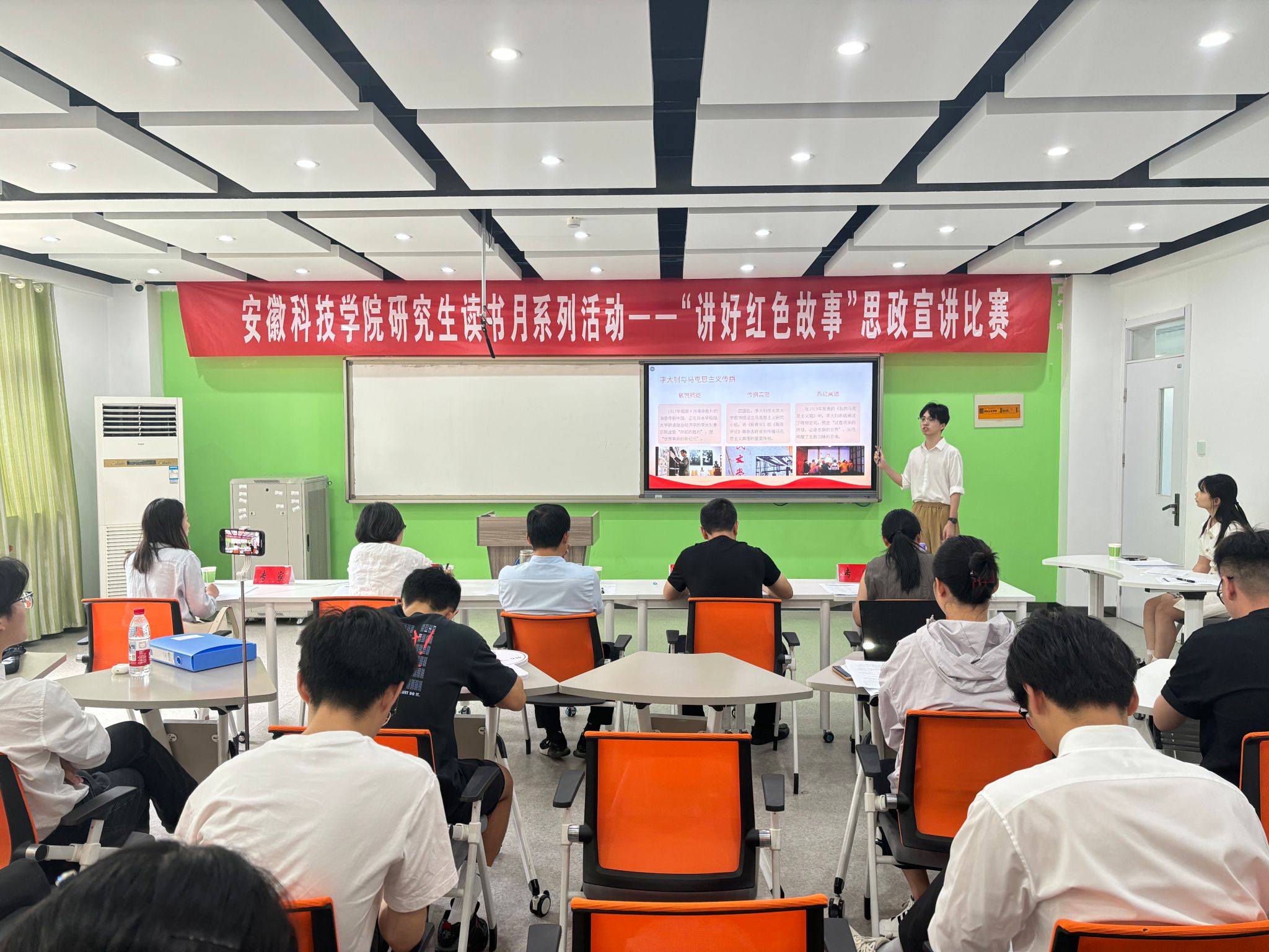 本次活动采取线上线下协同推进的方式,致力于打造多元立体的阅读体验。线下板块围绕读书分享会、红色剧本杀、思政宣讲比赛三大主题深入开展。在读书分享会活动中,通过师生共读《红岩》《觉醒年代》等经典著作,结合革命先驱事迹探讨青春使命。“红色剧本杀”环节沉浸式还原革命历史场景,激发学生对红色文化的情感认同与深层理解;思政宣讲比赛则通过17名选手深情讲述百年党史中的英雄故事,从李大钊的信仰之光到小岗村的改革精神,生动展现了红色基因的时代传承。