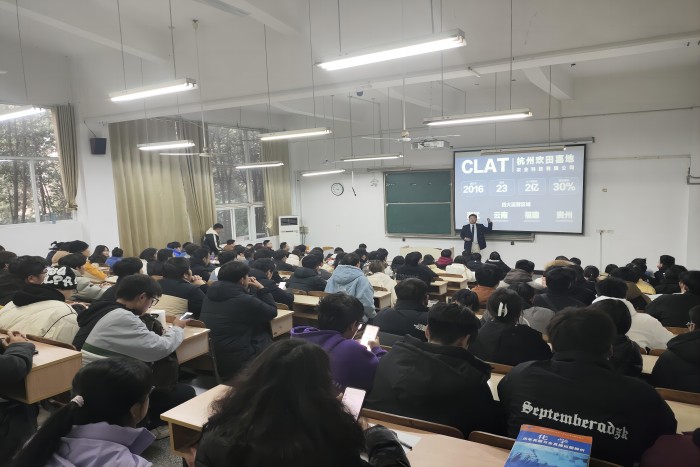 2023年12月27日下午,杭州欢田喜地农业科技有限公司校友携手开云网页版农学院共同举办的大学生就业指导宣讲会在求知楼A107教室顺利召开。参会人数达130余人,本次会议由农学院党委副书记张轶辉主持,杭州欢田喜地农业科技有限公司2017级植保、农学优秀毕业生韩璞、张祥主讲。