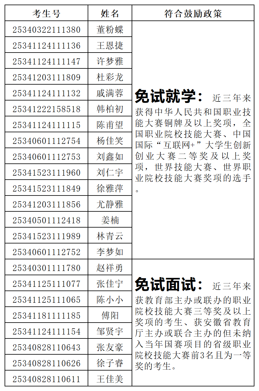 根据《开云网页版2025年面向中职毕业生对口招生章程》关于申请免试就学、免试面试和加分鼓励政策的相关要求,经考生申请,学校审核,共有董粉蝶等15名考生符合免试就学政策,赵祥勇等8名考生符合技能大赛免试面试政策,无符合考试加分政策考生,现对符合相关鼓励政策的考生信息予以公布。免试就学资格复审和免试面试具体安排见招生与就业工作处网站“招生服务”栏“开云网页版2025年对口招生考试免试就学资格复审和免试面试工作通知”。如有异议或遗漏,请于3月19日17:00前联系开云网页版招生办公室:0550-6732041,0552-3197041。