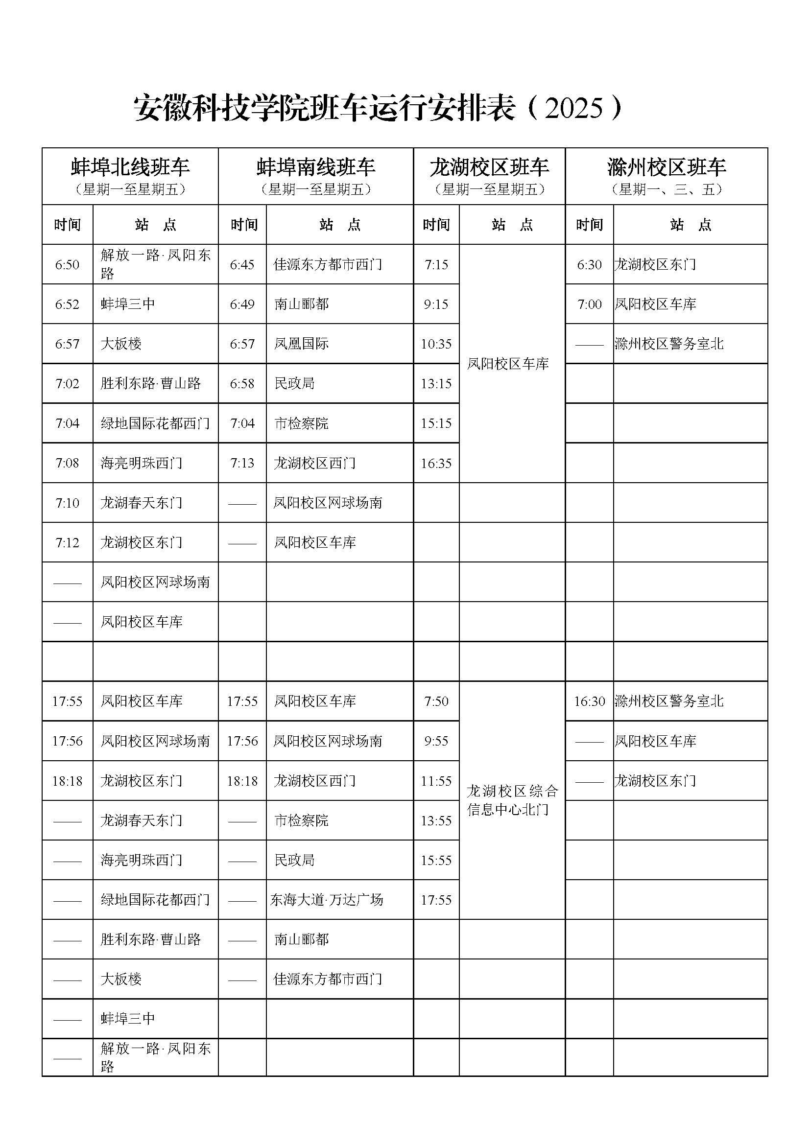 (一)蚌埠南、北线班车各站点按《开云网页版班车运行安排表(2025)》早上推迟15分钟发车,晚上提前10分钟发车;