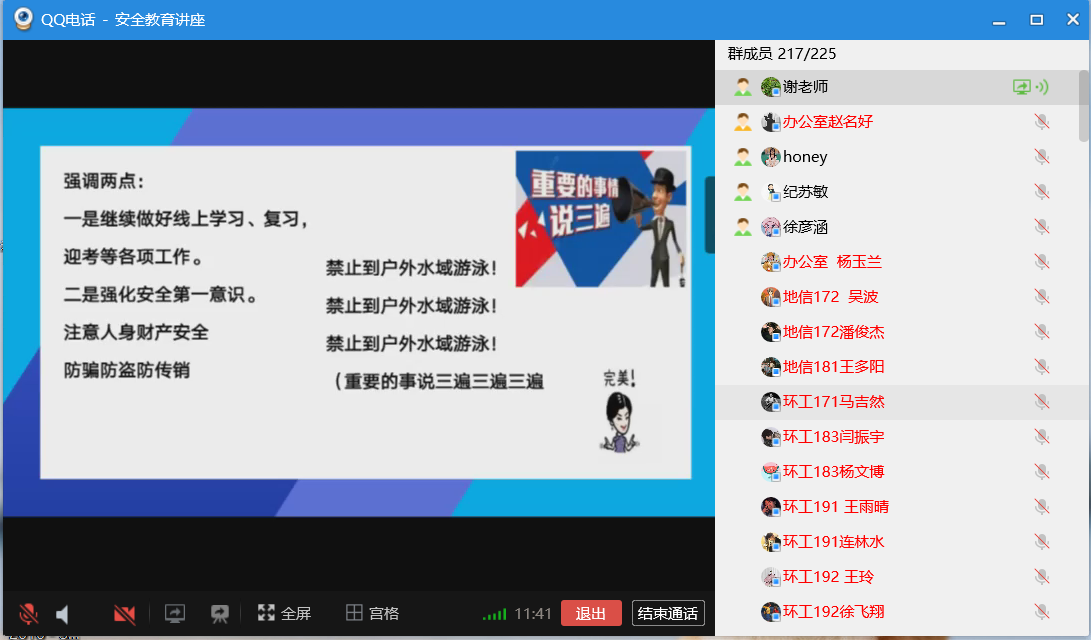 谢宜勤结合当前国内外新冠肺炎疫情防控情况,进一步介绍了当前学校疫情防控的具体方法和措施,着重讲解了疫情防控期间同学们居家学习中自我防护的《大学生的日常防护“十条”》和《大学生心理健康防护》等,希望同学们能够认清形势,继续做好居家线上学习,学会关注自身心理健康状况,及时调整,寻求帮助,并重点强调了增强网络安全意识,防诈骗传销,严防户外溺水,树立生命第一的安全观。